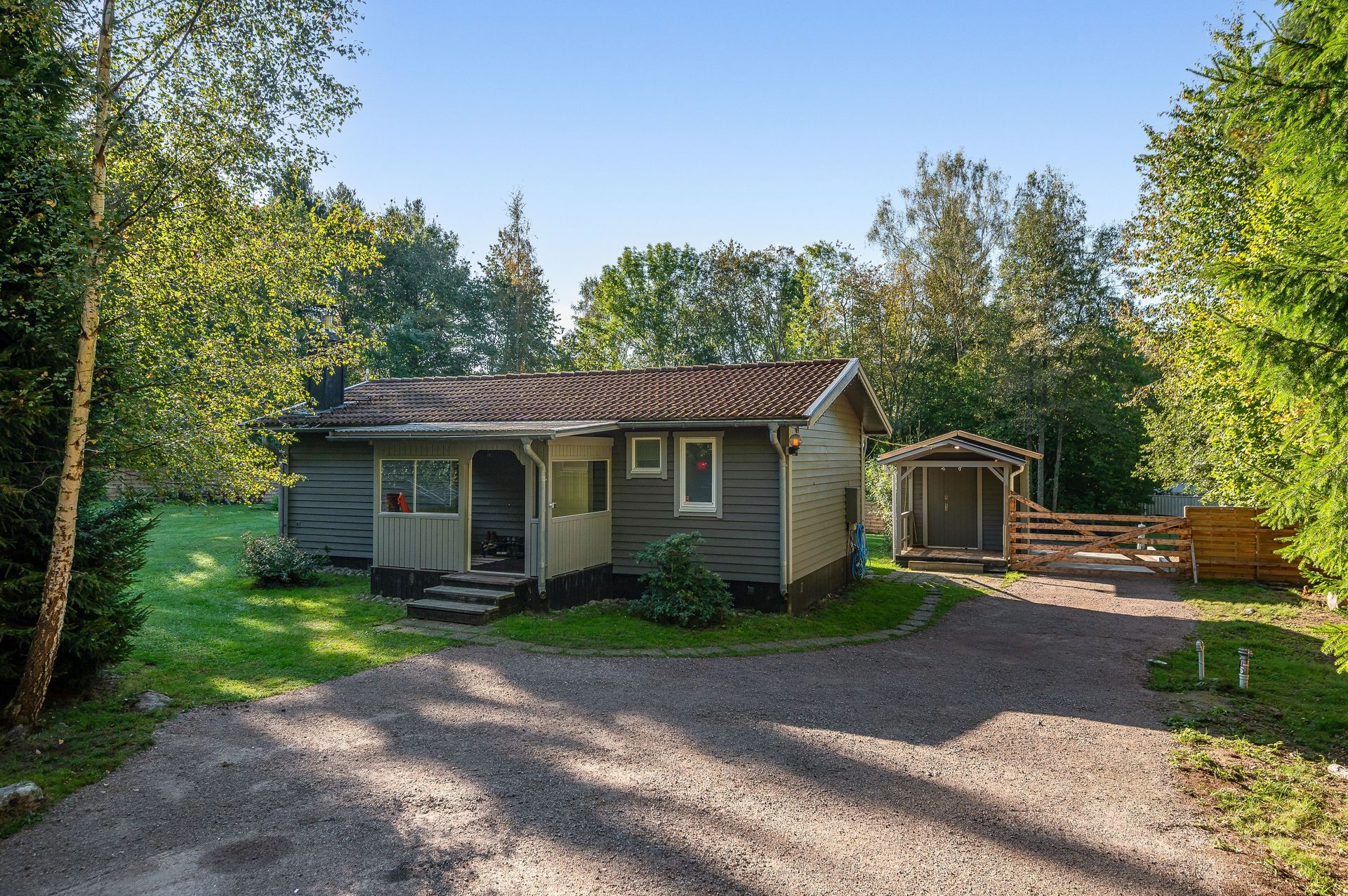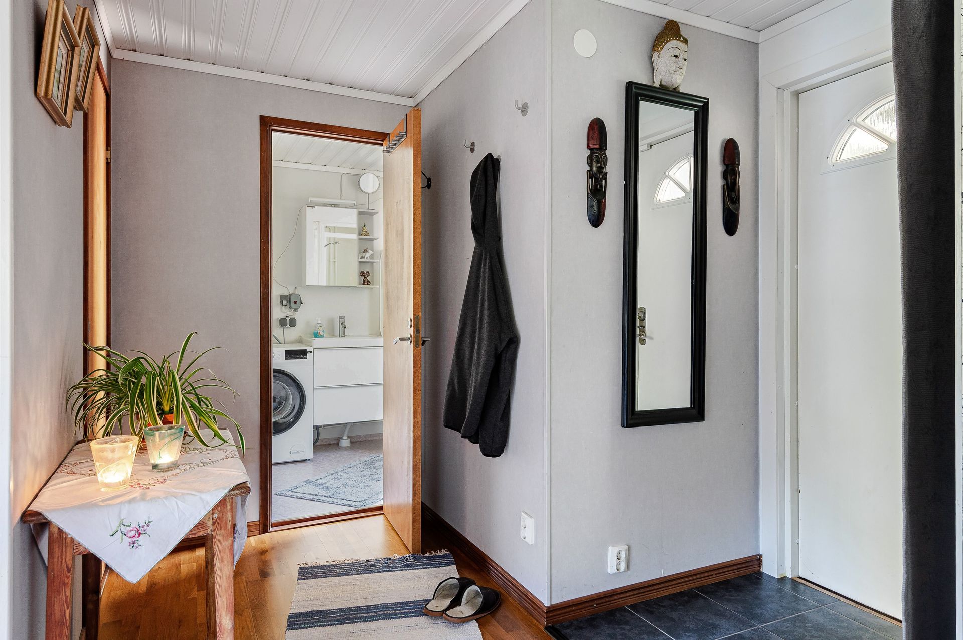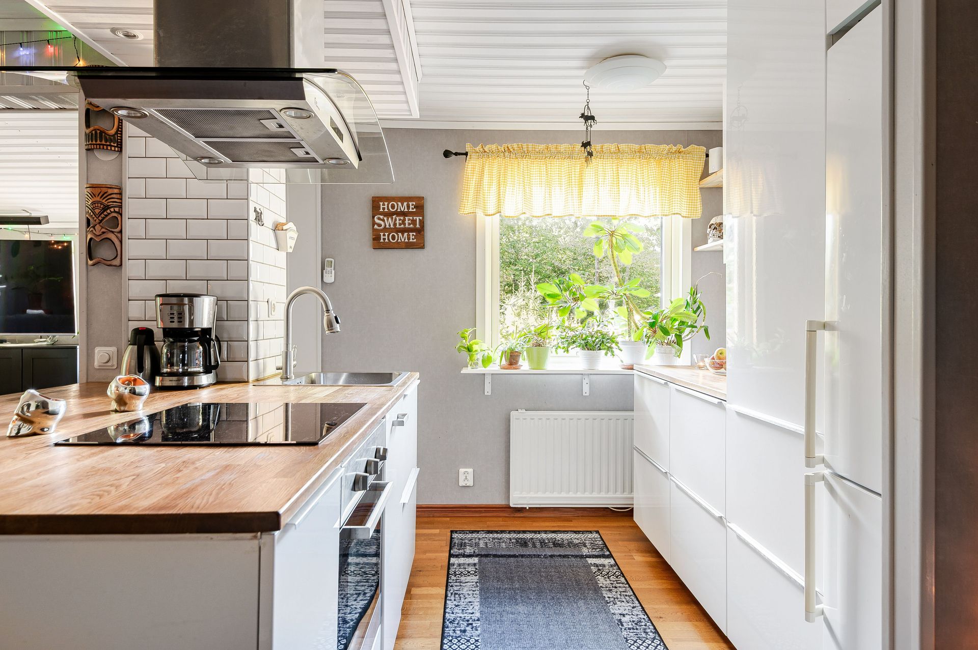 Hall vid entré Inglasad veranda leder oss in till hall vid entré med klinkergolv. Kök Kök renoverat 2013 med vita köksluckor. Spishäll med induktion -13, varmluftsugn-13, spisfläkt -13. kyl/frys -13, diskmaskin -21, arbetsbänkar av massivt trä. Ny köksblandare -24.Skafferi. Målad träpanel i tak. Öppen planlösning mot vardagsrum. Vardagsrum Rymligt vardagsrum som rymmer flera möblemang. Öppen planlösning mot kök. Utgång från vardagsrum mot altan i sydvästläge med markis. Parkettgolv-13. Braskamin. Luftvärmepump -14. Sovrum Sovrum med parkettgolv. Förvaring. Målad träpanel i tak. Fondtapet-21. WC/Duschrum/Tvättstuga WC/Duschrum med Wc ,tvättställ med kommod -22, spegelskåp -22, duschkabin, tvättmaskin. Våtrumsmatta på golv, målad väv på vägg. Fönster. Pax-fläkt. VVB 70 liter. Uteplats Altan i sydvästläge med markis Inglasad veranda med morgonsol. Takad veranda på gäststuga med morgonsol.