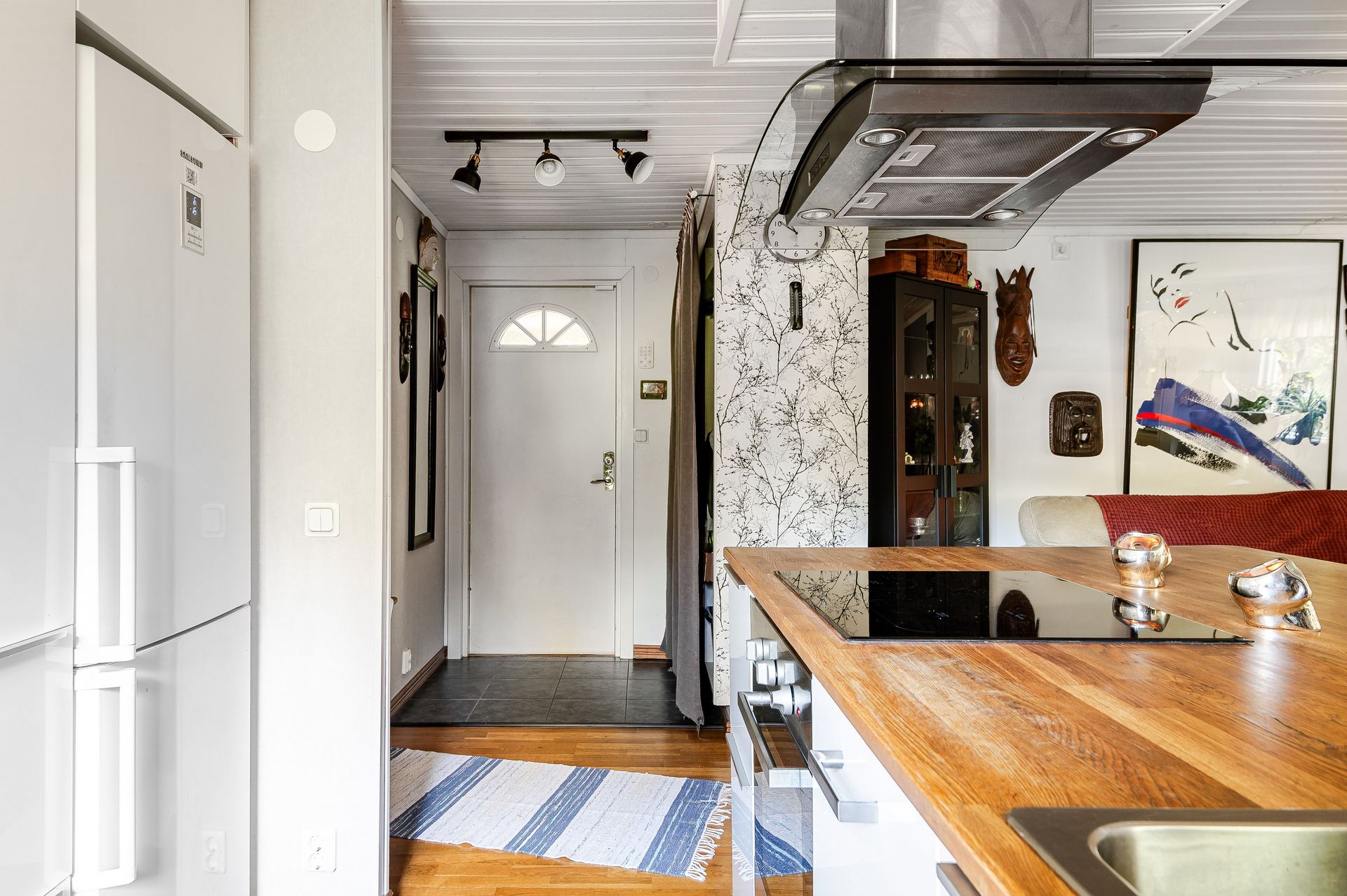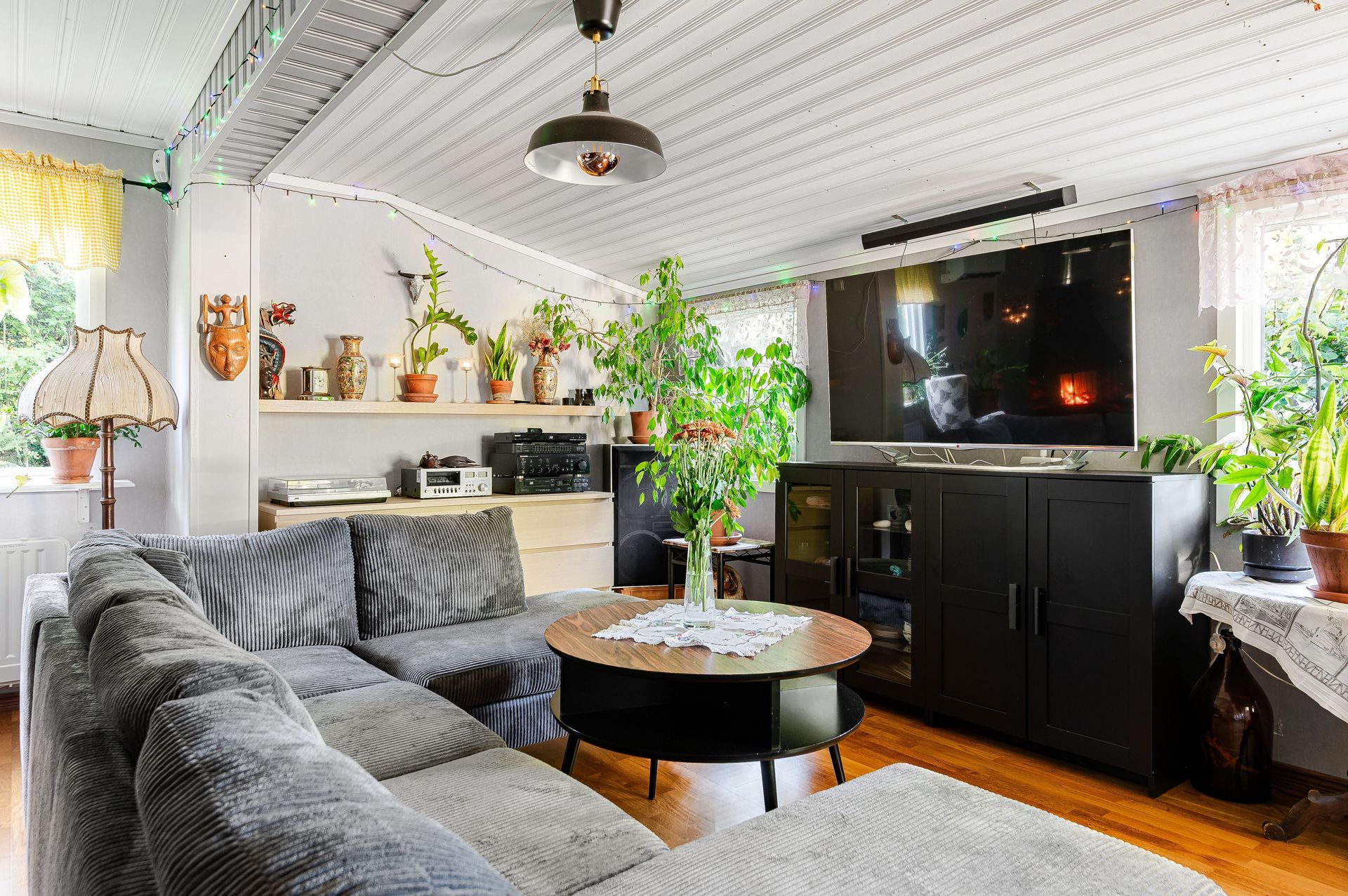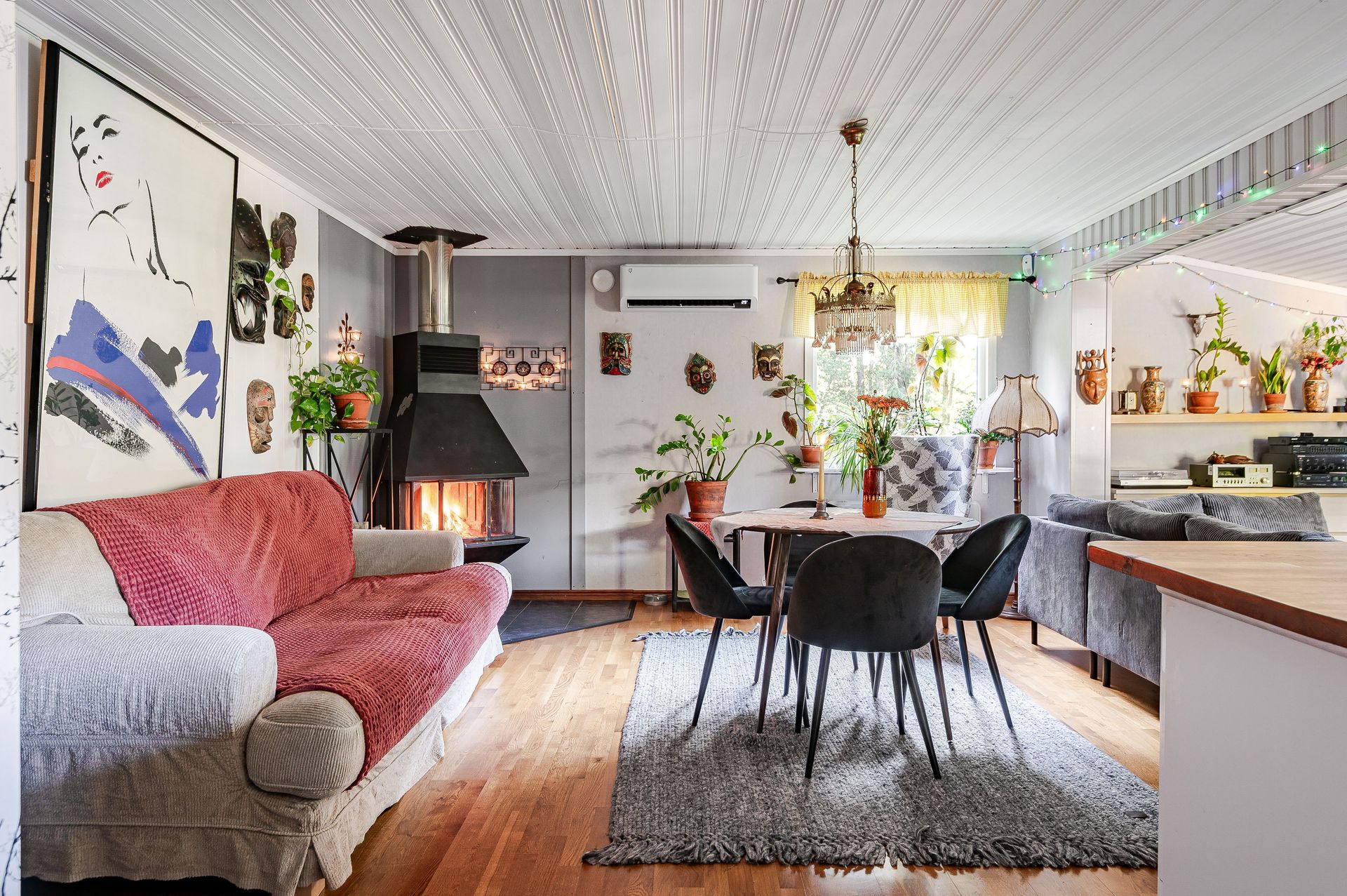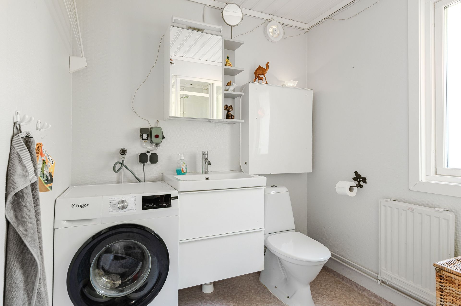 Hall vid entré Inglasad veranda leder oss in till hall vid entré med klinkergolv. Kök Kök renoverat 2013 med vita köksluckor. Spishäll med induktion -13, varmluftsugn-13, spisfläkt -13. kyl/frys -13, diskmaskin -21, arbetsbänkar av massivt trä. Ny köksblandare -24.Skafferi. Målad träpanel i tak. Öppen planlösning mot vardagsrum. Vardagsrum Rymligt vardagsrum som rymmer flera möblemang. Öppen planlösning mot kök. Utgång från vardagsrum mot altan i sydvästläge med markis. Parkettgolv-13. Braskamin. Luftvärmepump -14. Sovrum Sovrum med parkettgolv. Förvaring. Målad träpanel i tak. Fondtapet-21. WC/Duschrum/Tvättstuga WC/Duschrum med Wc ,tvättställ med kommod -22, spegelskåp -22, duschkabin, tvättmaskin. Våtrumsmatta på golv, målad väv på vägg. Fönster. Pax-fläkt. VVB 70 liter. Uteplats Altan i sydvästläge med markis Inglasad veranda med morgonsol. Takad veranda på gäststuga med morgonsol.